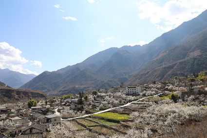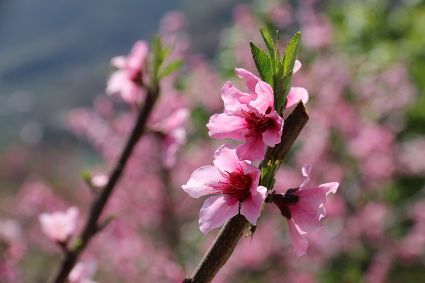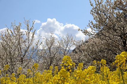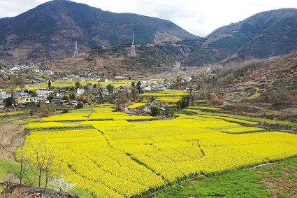 在瀘定縣冷磧鎮(zhèn)、德威鎮(zhèn)等地,桃花、油菜花及櫻花競相開放,一團(tuán)團(tuán)、一簇簇,綴滿枝頭,藍(lán)天、白云與各色花兒相交,金黃花海在微風(fēng)中起伏。一畦畦油菜花田錯落有致、層次分明,綿延不斷?!岸聶鸦ㄩ_,三月桃花盛,四月紅櫻桃,五月水蜜桃。”除了油菜花,每年陽春三月,瀘定的桃花也隨著和煦春風(fēng)落滿枝頭滿樹的花芽沁著香氣,一點點溢到空氣中,香了春風(fēng),也香了整座城。