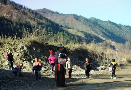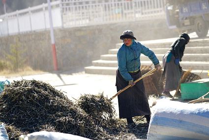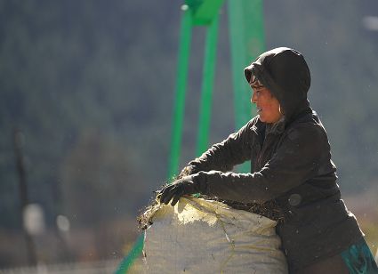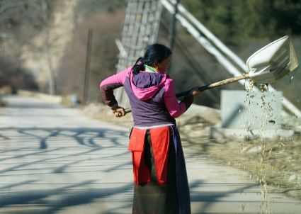 一群孩子會準(zhǔn)時(shí)來小二樓叫我,要去密林,要去山岡,要去尋找?guī)в薪?jīng)文的瑪尼石,還要去那個(gè)神秘的洞頂。比孩子們更準(zhǔn)時(shí)的是掛在小二樓上的四個(gè)大喇叭,鳥雀剛醒來,廣播就開始了,就必須要起來了。穿過巷道,和打豆子的人們一起享受勞動的幸福。我們在一起,等待著下午的廣播,因?yàn)閺V播會給我們帶來無盡的喜悅。