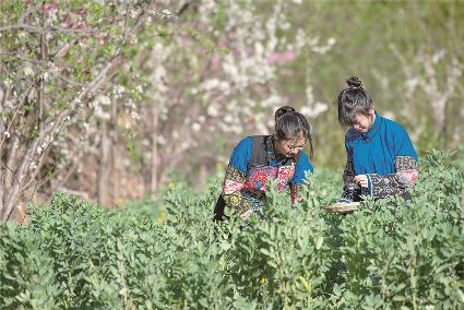 抬望眼,坡上繁花似錦,余暉里,若粉色華蓋覆于坡上,若云若霞。桃林置身峽谷之中,粉面朝天,明艷非凡,宛如閨秀;人家坐落山麓之上,披煙戴云,絕食煙火,疑為仙廬;山溪清卷碧波而去,棲云而眠,漱石而歌,響似佩環(huán)。橘色棧道蜿蜒而上,桃花林里若隱若現(xiàn)棧道間著漢服者,或留倩影,或嗅花香;拾級而上,又見客家姑娘,身著藍(lán)底配黑褂,綴以白色圖案,提籃摘豆,俯身拾花,別在耳鬢遠(yuǎn)望,若畫中紅印印在發(fā)間,身后白色梨花綠色葉。