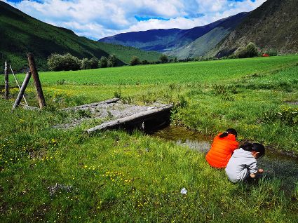 一處處水洼,清冽透亮,遠(yuǎn)處的花樹、房屋在水面的倒影隨微風(fēng)輕輕蕩漾,水里,蝌蚪在草間嬉戲,水邊,身著彩衣的孩童駐足玩耍,羨慕她們的童年,更羨慕她們的童年在這樣如畫的美景里。