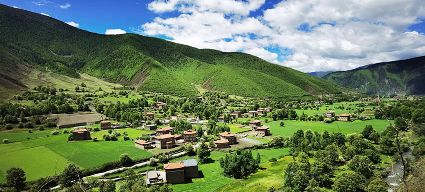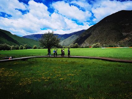 夏日,暖陽溫柔,沿途入眼皆是綠意。聽說,俄色花盛放的時候,潔白的花成簇成團(tuán),一樹樹漫山遍野,像九天的云朵堆滿山谷田野,汽車從公路疾馳,風(fēng)里都是俄色的清香。我們來的時候稍微遲了,錯過了俄色的花期,花開荼蘼,殘花在蒼翠的枝葉里躲藏,風(fēng)里是飛舞的花瓣,紛紛揚(yáng)揚(yáng),在棕紅的棧道鋪成白色的云錦,樹下是芬芳的余味。棧道邊,金黃的雪白的野花鋪灑在翠綠的草甸上,像濃烈的水彩。地里的青稞,綠得晃人眼睛,綿延的是木雅人勤勞與希望。遠(yuǎn)處,木雅民居在各種深綠淺綠的陪襯下更加的濃墨重彩。