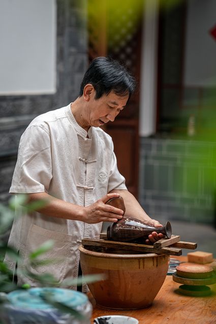 生活在云南省紅河哈尼族彝族自治州建水縣碗窯村的徐榮洪是當(dāng)?shù)匦旒腋G的第五代制陶藝人,也是非遺建水紫陶燒制技藝的傳承人。 泥料制備、拉坯造型、濕坯裝飾、雕刻填泥、高溫?zé)?、無釉磨光……要想做出精良的紫陶工藝品,每個流程都需要潛心鉆研?!爸谱骷妓嚟h(huán)環(huán)相扣,某一道工序出現(xiàn)紕漏,燒出來就是瑕疵品?!?徐榮洪拿起刻刀,對陶坯表面開始進(jìn)行雕刻。 今年57歲的徐榮洪小時候就跟著長輩上山挖陶泥,多年來堅持鉆研建水紫陶的制作技藝。 徐榮洪介紹說,作為紫陶藝人,以陶為紙,根據(jù)器型將不同的文化與藝術(shù)形式注入其中,使其具有無限活力。非遺文化閃爍著人類智慧的光芒,也承載著人們心底的情思鄉(xiāng)愁。