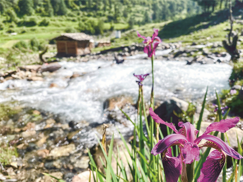 女人們相約去后山林中撿野生菌。一位穿氆氌袍子的老牧人領(lǐng)著小孫女,還有一只勇猛地藏獒,在石屋后方的草坪上等太陽。微風(fēng)輕拂著他們腳邊盛開的鳶尾花,細(xì)聽,那鈴鐺般的花朵搖響嘶嘶桑桑的音樂。小女孩在花叢中那條伸向牧場的小路上撿拾白色的小石子,裝入衣包里,鼓脹后就取出一枚枚投向花叢中的黑蝴蝶,令它的世界撲朔迷離。老牧人瞇縫著眼睛,翻轉(zhuǎn)粗糙的手心手背,仿佛要使它也開出鳶尾花朵來。我朝他們走去,小女孩朝我跑來,撲進(jìn)我的懷中喊我阿尺。我撫摸她頭頂上的卷發(fā),像撫摸著一只乖覺的小鹿。