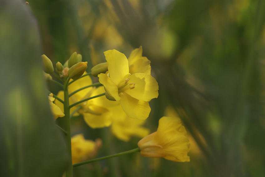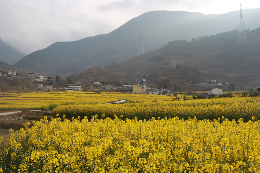 金黃的油菜花美美地填滿了整片田野,與藍天白云、村落人家相映成趣。順著田埂漫步花海,花香四溢,沁人心脾。微風(fēng)吹來,一朵朵油菜花在風(fēng)中搖曳,嬌嫩的花蕊隨風(fēng)飄動,仿若身著金黃色輕紗的少女在翩翩起舞,靈動迷人。在花叢中飛舞的蜜蜂為花田增添了靈動和生氣,一掃冬日的沉悶,帶給人明快舒朗的好心情。成片盛開的油菜花與前來賞花的游人相映成趣,游人們拿出手機、相機,尋找最佳的角度,定格醉人美景,讓人忍不住贊嘆:好一番田園美景。