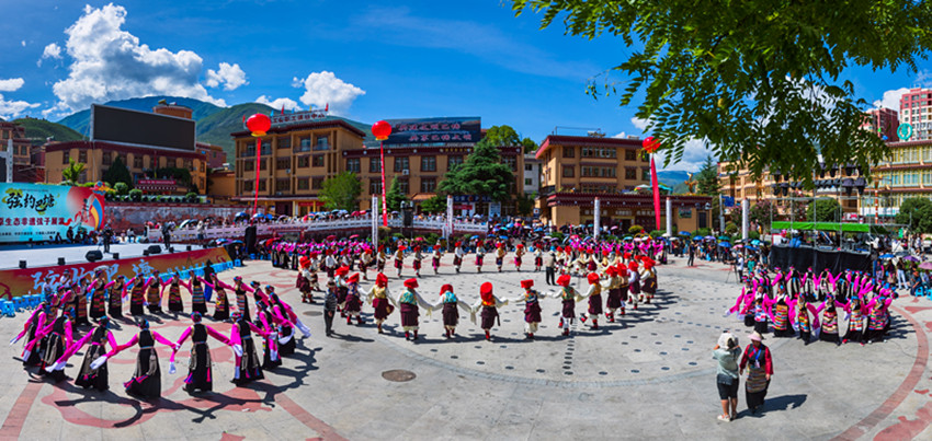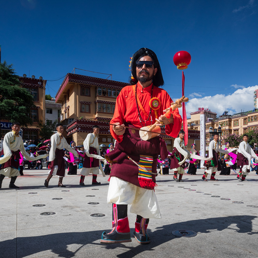 金弦子廣場,舞者們仿若守護(hù)者一般,圍著金黃色的弦子雕塑,或輕歌曼舞或昂揚踏步,斑斕的畢旺、搖曳的流蘇和飄逸的紅袖與花共舞,與景相映,聲聲吟唱、步步踏尋,是追憶更是誓言。