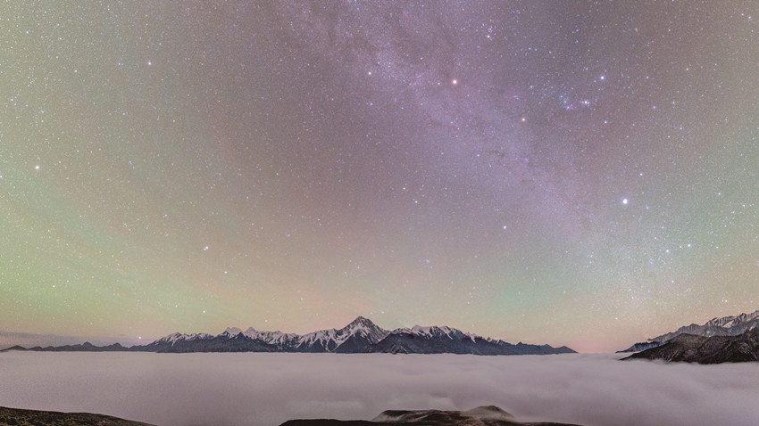 我州地廣人稀、海拔較高,光污染較少,離康定城區(qū)不遠(yuǎn)的折多山頂、子梅埡口、雅哈埡口等地,云層稀薄,空氣干燥,視野開闊,晴朗天氣下,每當(dāng)夜幕降臨,銀河肉眼清晰可見,如煙似紗,置身其中,如夢似幻。星河像一道氣勢磅礴的瀑布、一幅色彩斑斕的油畫、一束絢麗多彩的禮花,令人贊嘆,驚艷眼球,壯美異常。