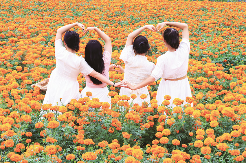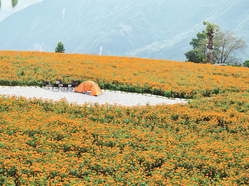 在這金風送爽的秋日,瀘定德威加郡海子村18萬株萬壽菊競相綻放,漫步在花海之中,人們可以感受秋風的輕撫,呼吸清新的空氣,寧靜的村寨依托著貢嘎雪山、藍天白云,在成片的萬壽菊裝點下構成了一幅亮麗的鄉(xiāng)村畫卷。