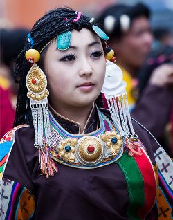 藏裝的基本特點(diǎn)是長(zhǎng)袖、寬腰、大襟、肥大。直線寬邊,色彩對(duì)比強(qiáng)烈。男女藏袍均習(xí)慣以粗紡厚毛呢為料,左襟大,右襟小,一般在右腋下釘一個(gè)紐扣,或是用紅、藍(lán)、綠、雪青等色布做兩條飄帶,穿時(shí)結(jié)上。男式藏袍多為黑、白兩色,領(lǐng)圍、袖口、衣襟和底邊,鑲上色布或綢子底邊,古樸渾厚。夏天或勞動(dòng)時(shí),一般只穿左袖,右袖從后面拉到胸前搭在左肩上,也可左右袖均不穿,兩袖束在腰間,古銅色的皮膚袒露于外,雄風(fēng)凜凜,彪悍剛健。女式藏袍,分有袖和無(wú)袖的兩種,夏秋兩季的藏袍無(wú)袖。里面多襯有紅、綠等色彩鮮艷的襯衣,襯衣翻領(lǐng)在外,衣袖要長(zhǎng)于胳膊一至二倍,長(zhǎng)出部分,平時(shí)卷起,舞蹈時(shí)放下,舒展飄逸,瀟灑自如。藏族的帽子式樣繁多,各地均有不同,拉薩等地以金寶頂帽為最多,用金絲或銀絲繡織圖案,在陽(yáng)光照耀下,閃閃發(fā)光。金花帽是男女老幼都喜歡戴的民族帽。男女穿的藏靴,底高二寸,靴腰高至小腿以上,靴面用紅綠相間的毛呢裝飾,繡有圖案花紋。靴頭向上隆起。藏族男女喜歡佩飾。耳穿大環(huán),手腕金銀,頂戴珠鏈,尤其是在腰間,男挎長(zhǎng)劍,女佩腰刀,更顯得粗獷彪美。