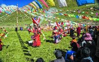 格薩爾王在藏族的傳說里是神子推巴噶瓦的化身,一生戎馬,揚(yáng)善抑惡,宏揚(yáng)佛法,傳播文化,成為藏族人民引以為自豪的曠世英雄。這是筆者在格薩爾誕生地——德格阿須草原現(xiàn)場(chǎng)拍攝的一組照片,它呈現(xiàn)了康巴藏區(qū)送文化下鄉(xiāng),牧民如過節(jié)一樣歡樂的盛況。該組圖片為演出現(xiàn)場(chǎng)。