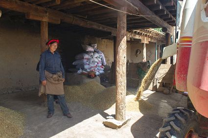 近日來(lái),我州等地天氣情況轉(zhuǎn)好,當(dāng)?shù)夭刈逋プ∮欣r(nóng)時(shí),利用大型農(nóng)機(jī)和人力搶收青稞。據(jù)了解,川藏公路國(guó)道317線甘孜段(爐霍至馬尼干戈段)2013年改造完成后,當(dāng)?shù)厝罕娍梢酝ㄟ^(guò)317線方便地運(yùn)輸糧食和大型農(nóng)機(jī)具,農(nóng)業(yè)生產(chǎn)條件得到很大改善。(新華社記者 胡超攝)