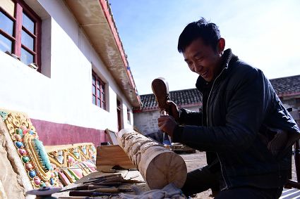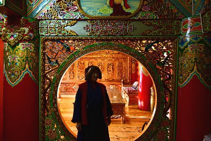 道孚民居的精華在其內(nèi)部,木材是其唯一的內(nèi)部裝飾材料,而裝飾,是一項(xiàng)繁瑣得曠日持久的藝術(shù)勞作,往往建房只需一兩個(gè)月,內(nèi)部裝飾則要幾年甚至幾十年。民間建筑藝術(shù)家們沉醉在細(xì)致入微的勞作里,讓每一個(gè)圖案都盈溢一份心底的吉祥,讓每一筆描摹都傳遞一份動(dòng)人的傳說(shuō)。房間四壁、房門(mén)和梁柱上一般都繪滿了精致典型的藏式壁畫(huà),窗上分別雕刻著龍、鳳、仙鶴、麒麟等吉祥圖案。每間屋的大門(mén)上都鑲嵌醒目的兩個(gè)獅頭大銅環(huán),凸顯了與之相融的漢文化的特點(diǎn)。置身其間,色彩斑斕中,身邊盡是龍飛鳳舞,鶴翔麟躍。繽紛中細(xì)端詳,真是藏民族藝術(shù)的天堂!
