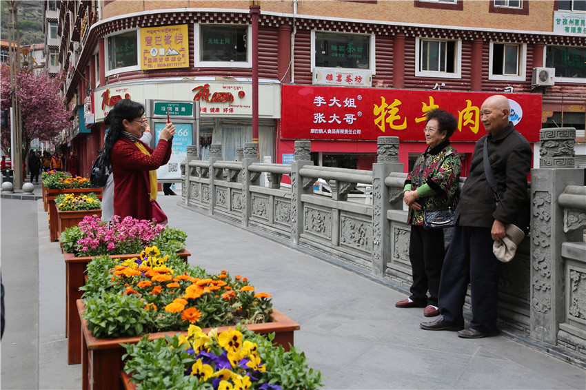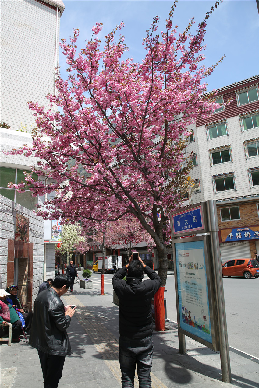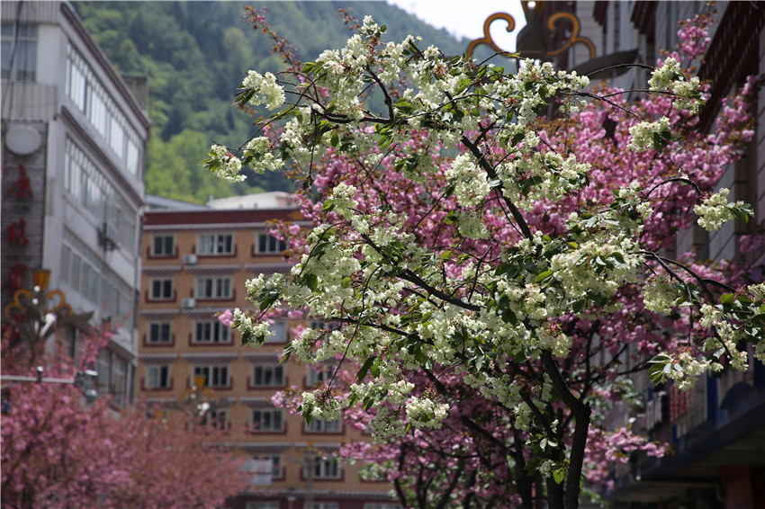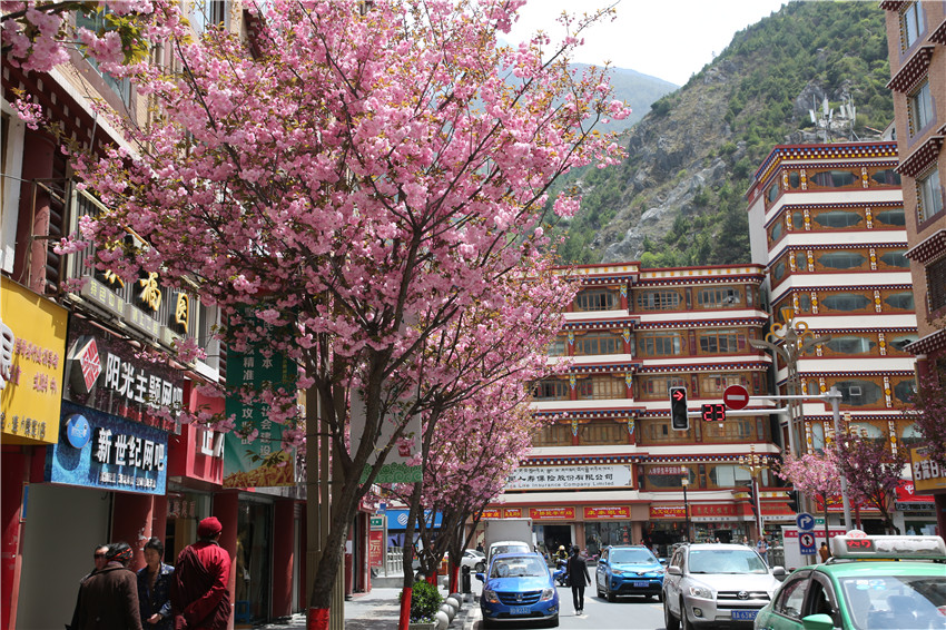 當春天遇見最美的櫻花時,驚艷了整個康定。櫻花與身邊人都將成為春日里的浪漫風(fēng)景。櫻花之美,美在氣勢,櫻花紛飛,夢幻唯美。每年4月中旬,康定城北門的櫻花綻放后,人們像是約好了一樣聚集到這里,共赴這一場甜美盛宴。這一路繁花似錦,人們穿過枝椏花正盛的櫻花林,穿過粉色海洋,徑直奔向一個浪漫的童話,一路櫻花飄散,一路粉光燦爛。櫻花絢麗繽紛、陸續(xù)綻放,若恰逢一陣春風(fēng)經(jīng)過,櫻花瓣隨風(fēng)舞動,猶如紛落的雪花,空氣中浮動著櫻花特有的淡淡香氣,令人不禁懷疑自己置身夢境?!翱刀ǖ拇禾靵淼靡硪恍`放的櫻花,滿街的花草,折多河畔楊柳依依,康定的春天無比驚艷,醉了游人?!敝芟壬贿吪恼眨贿吀袊@,他在康定生活了40多年,20年前的康定,可以說找不到像樣的花草樹木,進入新時代,康定城市變美了,城市綠化走在了前面,城市的美譽度舒適度不斷提升。康定之春,春色滿園,姹紫嫣紅,風(fēng)光旖旎。