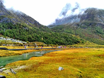 燦爛的陽光伴隨幾場秋雨秋霜過后,亞丁的秋天便更加絢麗多彩,漸黃的草地和青楊林開始爭奇斗艷,稻城的美變得更加富有層次,幾乎是一天一個變化,一天一個景色。山與水、人與情,一步一勝境。大片大片的高原草甸現(xiàn)在已經(jīng)逐漸變?yōu)辄S綠色,環(huán)抱高原海子的水草也由養(yǎng)眼的綠色向迷人的金色過渡。藍(lán)天白云、金色草甸、紅楓映白樺、秋水繞山間,幽靜的小徑,融合了感性的色彩和理性的沉靜,既有成熟的風(fēng)韻,又有灑脫的禪境。木質(zhì)棧道以“曲徑通幽”的姿態(tài)環(huán)景分布,所經(jīng)之地為負(fù)氧離子含量相對較高的森林區(qū)域,漫步林中,令人心曠神怡。無論是傳統(tǒng)的團(tuán)隊(duì)游,還是個性化的自助游、自駕游,在這里都能找到屬于自己的那份愉悅。