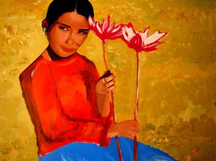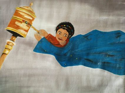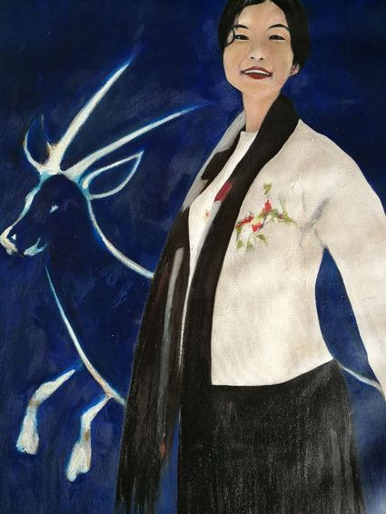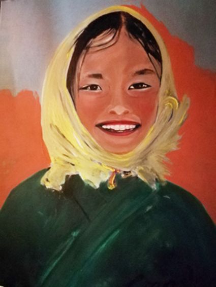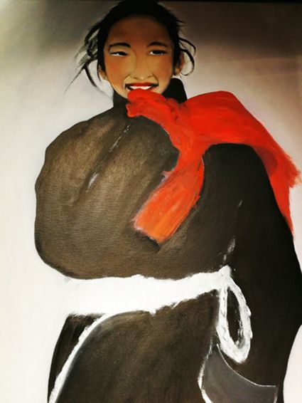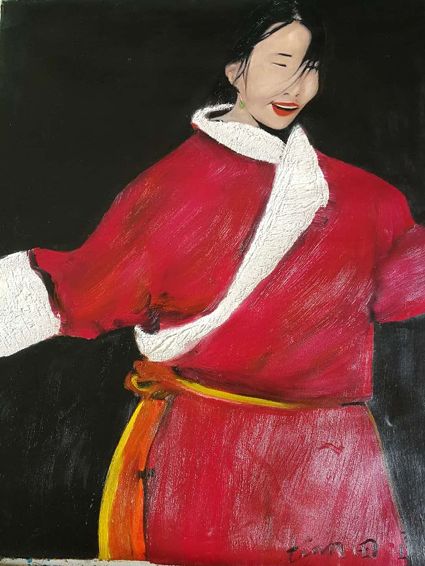 畫畫三年多了。十三歲寫詩(shī);到了高原后,方開始創(chuàng)作長(zhǎng)篇小說。在上海,我做過畫廊。但要說斗膽動(dòng)筆畫幅肖像。我是在白度母唐卡前燃了三炷香的。包括在咖啡店現(xiàn)場(chǎng)作畫。到京城繼而國(guó)外辦畫展,我認(rèn)為都是因了我把畫布當(dāng)成了詩(shī)稿的緣故。于是,大家喜歡我這種野路子,天馬行空,可又不舍方圓的創(chuàng)作手法。接下來,歐洲、東京還會(huì)有我的系列展覽。