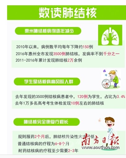 據(jù)惠州市結(jié)防所相關(guān)負(fù)責(zé)人介紹,惠州市近年(2011—2016年)發(fā)現(xiàn)肺結(jié)核病例2萬余例,絕大部分患者都能治愈,治愈率達(dá)到90%以上。2010年的一項(xiàng)流行病學(xué)調(diào)查顯示,惠州市結(jié)核病發(fā)病率為千分之二,目前這一數(shù)字已降至不到千分之一?!叭ツ臧l(fā)現(xiàn)3500例,發(fā)病率略低于全省平均水平,并且發(fā)病趨勢近年來逐年下降,2010年以來,病例數(shù)平均每年下降約150例?!眲⒅緰|表示,這跟防控工作的成效以及人們防護(hù)意識的提高密不可分。然而,目前結(jié)核病的防治仍然面臨嚴(yán)峻的形勢:一是發(fā)病人數(shù)多;二是耐藥結(jié)核病流行;三是學(xué)校存在發(fā)生結(jié)核病疫情的潛在風(fēng)險(xiǎn)。