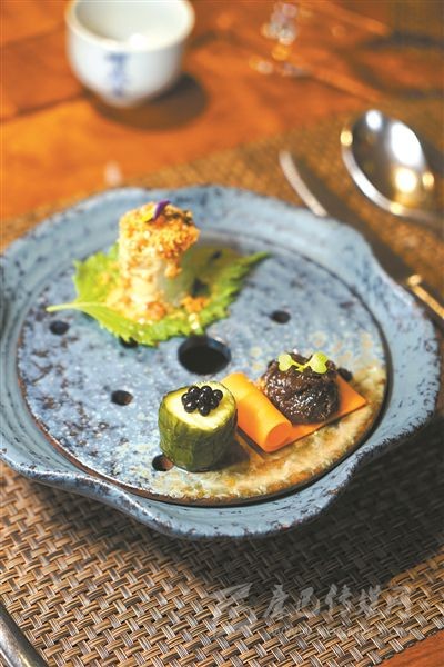 在不少素食店里,廚師會(huì)充分利用當(dāng)季食材,不時(shí)不食的廣府飲食理念也更為凸顯。慈姑、金桔都是春季的食材,因此被天水蔬食料理運(yùn)用到“雨水”節(jié)氣的菜單里。據(jù)店長介紹,慈姑是生長于水中植物,如同土豆一般軟糯。廚師用南乳和腰果做成堅(jiān)果醬,作為慈姑的配搭醬料。慈姑被切成片,中間夾著梅菜,再用堅(jiān)果醬“粘合”起來,還原慈姑原本的形狀,再通過烤箱烤制,再配搭撒上意大利黑醋的臺(tái)山花菜,口感豐富。金桔用來做甜品,將金桔挖空,里頭放入一個(gè)核桃,表面再鋪上一層風(fēng)干的金桔果干,做成一件小巧甜品“金桔核桃糖”,其設(shè)計(jì)靈感源自廣東金桔糖。與它一同出場的還有用金桔果肉打醬做成的金桔年糕,也十分甜美。