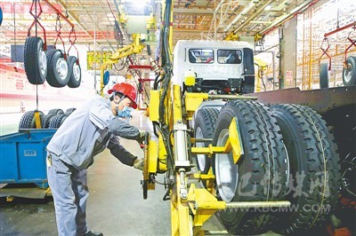 自復(fù)工以來,安徽馬鞍山市經(jīng)開區(qū)內(nèi)的華菱星馬汽車集團(tuán)一手抓疫情防控,一手抓生產(chǎn)和市場,各項工作順利推進(jìn),產(chǎn)能完全恢復(fù)到疫情發(fā)生前水平。圖為工人正在安裝輪胎。