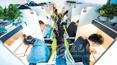 這是一家共享自習(xí)室。進(jìn)入這間屋子的人,有正在準(zhǔn)備考研、考公務(wù)員的大學(xué)生,有下班后為自己“充電”的職場(chǎng)人士,也有被家長(zhǎng)送來(lái)做作業(yè)的中學(xué)生。他們每天花費(fèi)50元到100元左右,就能為自己覓得一處安靜的學(xué)習(xí)天地,如果辦月卡、季卡、年卡,價(jià)格還能更優(yōu)惠。
