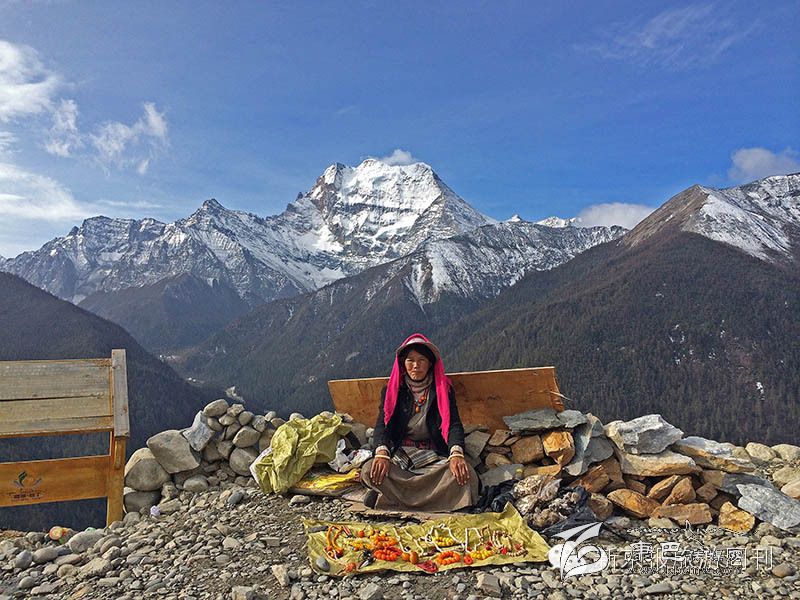 去往亞丁風(fēng)景區(qū)的路上,一位藏族婦女在觀景臺邊擺著地攤賣當(dāng)?shù)厥罪椇吞禺a(chǎn)。![]()
