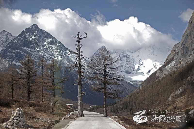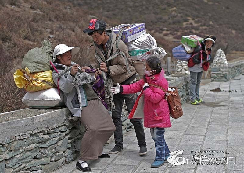 在海報4000多米的亞丁景區(qū),幾名當(dāng)?shù)鼐用癖持剡_(dá)百余斤物品走五公里往牛奶河居住地。通往洛絨牛場的山路。
