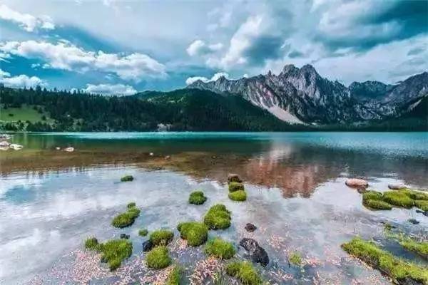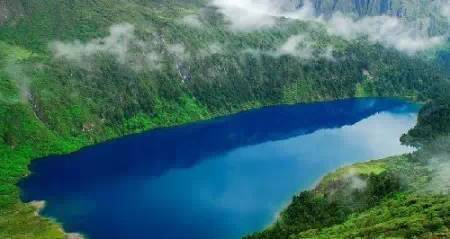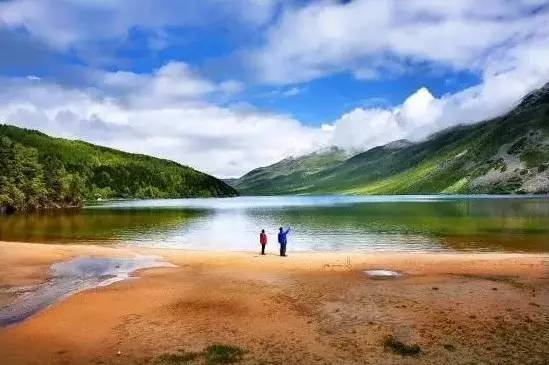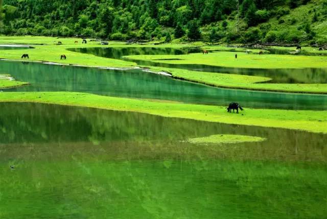 被原始森林和草甸環(huán)抱的五須海,當(dāng)?shù)厝擞鳛椤跋膳釆y的明鏡”,湖水碧綠透亮,將周圍的山水和天空全映照在湖面,幽靜的像一幅畫。從夏到秋周圍百花盛開,古樹盤根錯節(jié)、藤枝攀沿纏繞,杜鵑樹伸向湖面,仿佛進(jìn)入原始古樸的仙境。