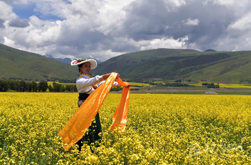 金黃的菜花與青山綠水、藏式民居相融,繪成一幅幅絕美的畫卷。據(jù)悉,道孚縣油菜盛花期將持續(xù)一個(gè)月?!坝筒嘶ㄩ_滿地黃,叢間蝶舞蜜蜂忙;清風(fēng)吹拂金波涌,飄溢醉人濃郁香”。在漫山遍野金黃色的油菜花中,掩映著華麗的藏式建筑,使得每一個(gè)逃離紛繁城市的人都能找到歸宿。(圖片由中新社記者 劉忠俊 攝)