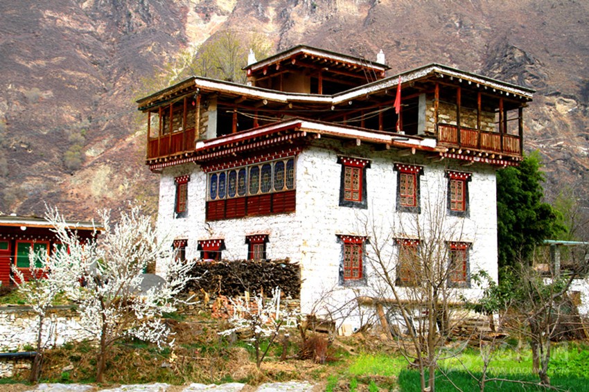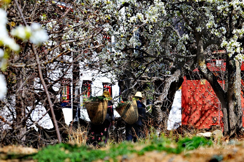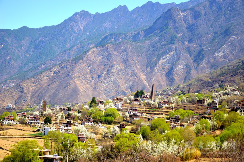 藏寨的梨花,并非成片的生長在一起,它們散落在村民的田間地頭和房前屋后,老干虬枝,滄桑感十足,仿佛是一個個“時間老人”,守望著藏寨的幸福變遷。