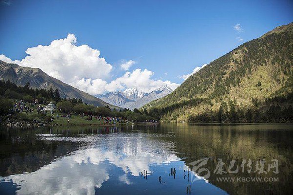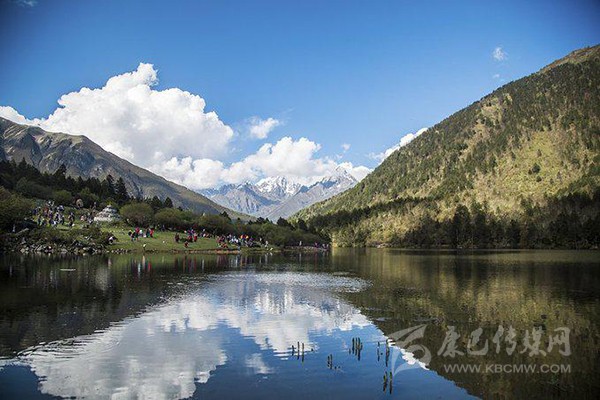 藥池沸泉一側(cè)是風(fēng)景秀美的俄瑪錯,上頂藍(lán)天白云和雪山,下踏森林綠水,讓人透心舒暢。