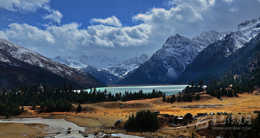 清寒伴著旭日高升,透過湖岸冷杉形成的樹之門望去,樹影被長長的投在湖面,孔雀藍、翡翠綠……有種空靈幽邃之感。新路海位于海拔6168米的德格縣的雀兒山腳下,它是著名的冰蝕湖。