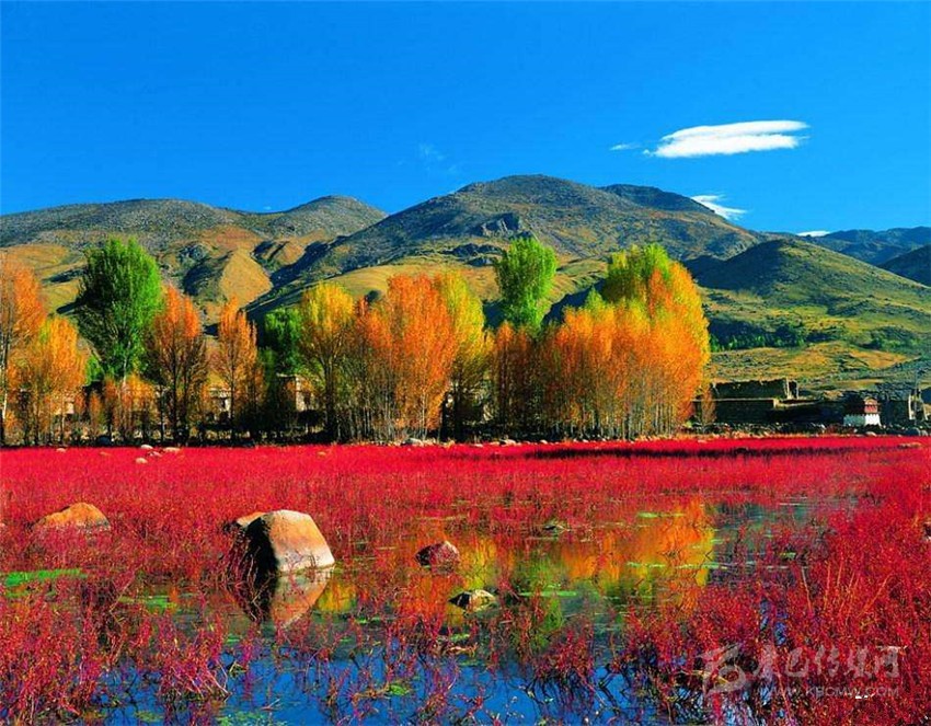 10月的紅草灘一片通紅,好像水面上在燃燒一樣,沒有草的水面將藍(lán)天白云倒映其中,背景又是一排排金黃色的楊樹林,結(jié)合在一起就構(gòu)成了這里如夢般五彩斑斕的世界。