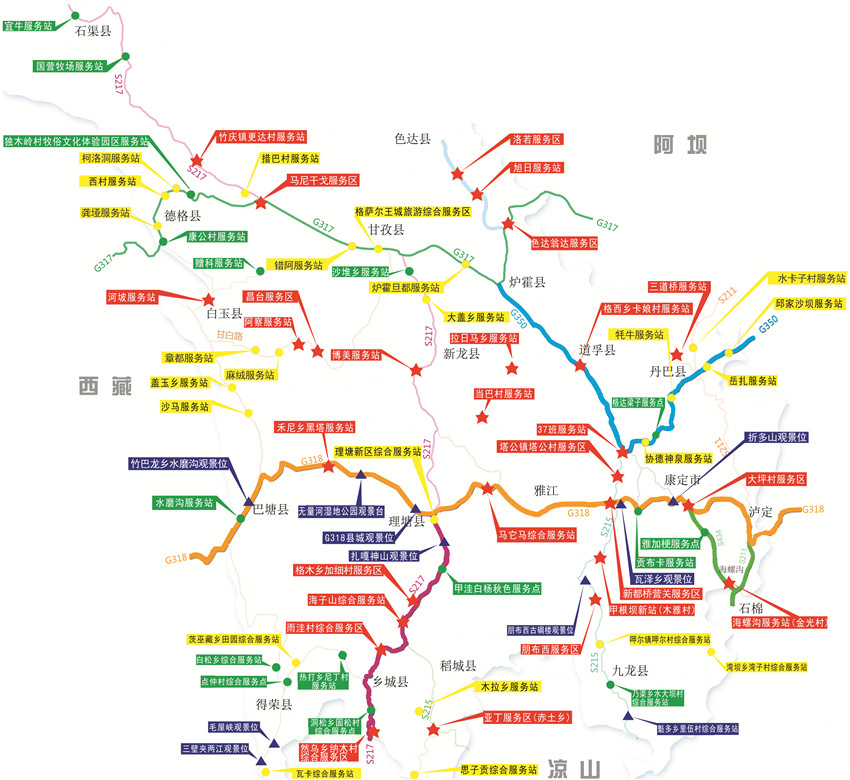 77個(gè)服務(wù)區(qū)(站、點(diǎn))地處我州六條旅游線路和十條景觀大道。主要集中在:G318線(瀘定——康定——雅江——理塘——巴塘),G350線(丹巴——八美——道孚——爐霍——色達(dá)),S217線(理塘——稻城——香格里拉鎮(zhèn)——亞?。?,S211線、S434線(瀘定——海螺溝——榆林)。
