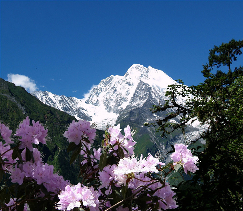 從海螺溝翻越雅家埂到康定的道路兩旁有很多品種的杜鵑花,埡口海拔1000米下生長的杜鵑花樹高大,以緋紅色、粉紅色、紫色為主。海拔越高,花樹越矮,從山頂?shù)缴窖恢变佒氖前咨幕ǘ?,像是交織在山野的白花地毯?/p>