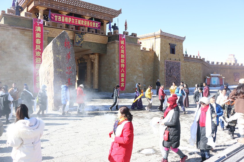 寒風不減游興,冬日游王城別有一番風情,游客們徜徉在格薩爾王城獨特建筑中,游覽了嶺國圣泉、千年神石、卓陵湖、格薩爾祈愿地、阿尼瑪卿雪山、阿克晁通寨子、更嘎尼瑪寨子等景點,并親自體驗景觀小品,每到一處大家都會用手機記錄下精彩瞬間,有的曬個朋友圈、發(fā)個抖音小視頻,有的干脆在王城里來個直播,領略格薩爾文化的魅力。