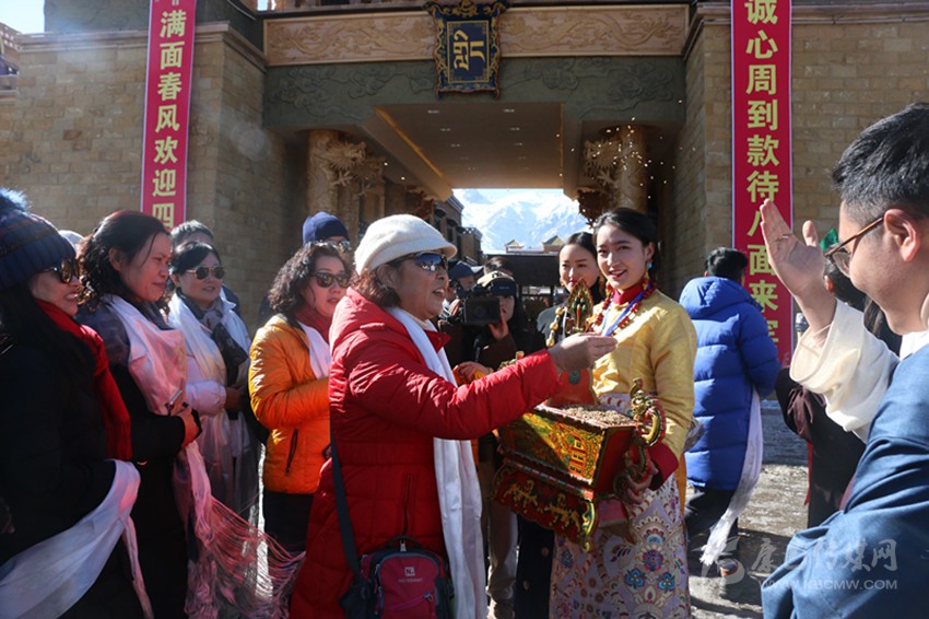 游客們剛到格薩爾王城門口就滿滿地感受到了當地人民的熱情,“嶺國四位大將”和“格薩爾王王妃”盛裝在城門口擊鼓迎接遠道而來的客人們,為他們獻哈達、敬青稞酒,帶領大家轉煨桑爐祈福,在切瑪盒前體驗灑青稞和糌粑祈福儀式。隨后,游客們在王城體驗了喝圣水、祈福、騎馬、射箭等項目。王城內宏偉的建筑,獨特的文化魅力,優(yōu)質的服務質量,讓遠道而來的游客贊不絕口。