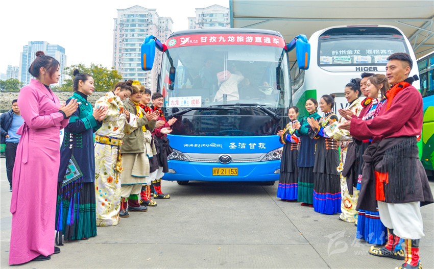 景區(qū)直通車授牌儀式和自駕游車隊授牌儀式也是本次推介會的亮點(diǎn)。兩項(xiàng)儀式旨在進(jìn)一步方便廣大游客到九龍旅游,并開啟成都直通九龍旅游及運(yùn)輸融合發(fā)展的歷史征程?,F(xiàn)場,貼有“穿越藏彝走廊,體驗(yàn)民俗風(fēng)情”和“甘孜九龍旅游直通車”車標(biāo)的汽車引得不少人注目,有的還當(dāng)即向工作人員咨詢票價、路線。
