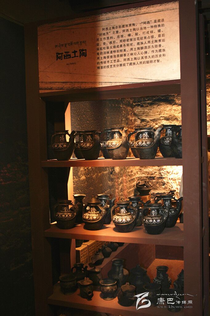 阿西土陶是藏家傳統(tǒng)土法制作的手工藝品,又稱藏族黑陶,因其燒制后呈黑色而得名。阿西土陶以當?shù)匾环N特殊的泥土為原料,加上其他兩種泥土混合而成,制作中不斷地捏、錘、敲、打,使之成型,還要用碎瓷做出花紋來點綴,最后架起松柴點火燒,在燒紅的土陶上灑上麥糠就呈現(xiàn)出黑色了。阿西土陶主要表現(xiàn)為陶鍋、陶罐、陶盆、陶壺、陶瓶等形式。最初,當?shù)厝艘蕴斟伒葥Q取其它地方的糧食或其它物品,現(xiàn)今的阿西土陶則已經(jīng)走向市場,更多地作為旅游商品和本地人的家庭裝飾品。
