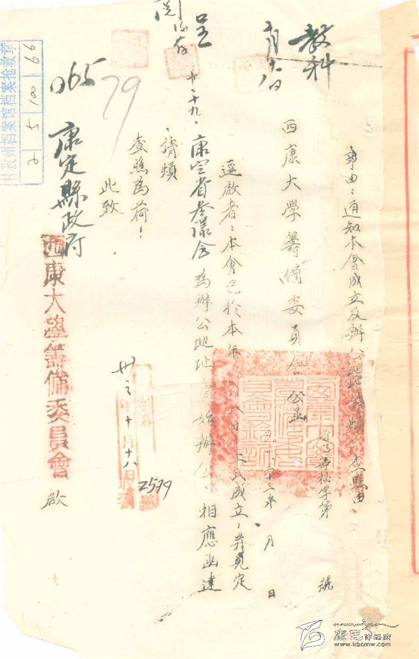 根據(jù)這份資料上“教科:10月18日”和“呈閱后存:10月19日”等字樣推算,這個“西康大學(xué)籌委會”可能是在10月8日成立的,這份函件是送往康定縣政府,告知“籌委會”辦公地點(diǎn)的一般函件。