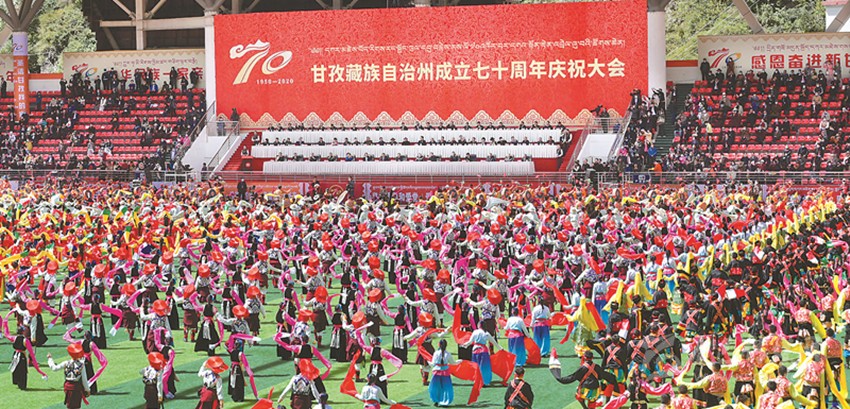 這一天,沿折多河兩岸的東西兩條大街上,人群如潮,青年學生的秧歌隊、腰鼓隊以及康定城各族各界人民組成的弦子隊,將古城康定揮舞成了一條人群歡樂的哈達,鞭炮聲、口號聲和歡呼聲響徹跑馬山麓。當晚,康定的四十八家鍋莊及主會場(后來的康定賓館內)燃起了一堆堆篝火,康定人民載歌載舞,通宵達旦,歡慶人民當家作主。
