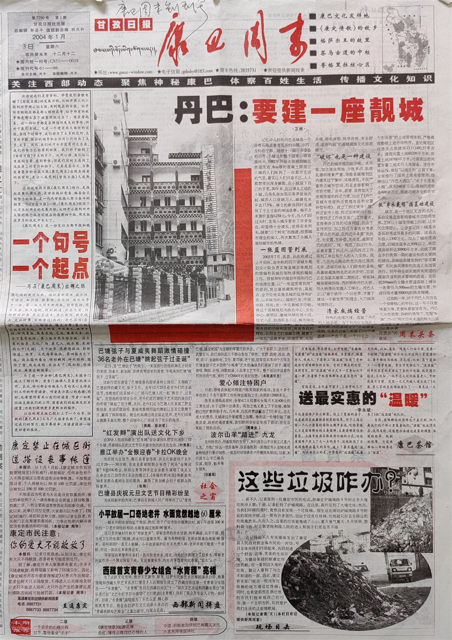 經(jīng)過緊鑼密鼓的籌措后,2004年1月3日,也就是在《甘孜報》正式改為《甘孜日報》的第三天,第一期《康巴周末》與讀者見面了?!犊蛋椭苣穭?chuàng)刊號的報頭是時任《甘孜日報》社副總編輯胡慶和先生書寫的,同時還配發(fā)了我撰寫的題為《一個句號、一個起點》的發(fā)刊詞。創(chuàng)刊號第一版推出的是周末新聞版,當期與讀者見面的欄目包括:周末頭條、社會之窗、直通康定、現(xiàn)場目擊、康巴茶館、西部新聞拼盤等;第二版為周末綜合版,推出的是案例拾萃、健康文本欄目;第三版為周末綜合版,推出的是文化廣場欄目;第四版為天下版,推出的是國內(nèi)外奇聞逸事。此外,《康巴周末》創(chuàng)刊伊始,還推出了有獎征集新聞線索活動,凡是提供有一定新聞價值的社會新聞,經(jīng)采訪核實后,都會給予線索提供者一定獎勵。這種線索征集活動,不但擴大了新聞源,還在一程度上為《康巴周末》迅速贏得讀者的青睞起到了推波助瀾的作用。直到后來在舉辦《康巴周末》創(chuàng)刊一百期活動時,讀者還對此給予了充分肯定。