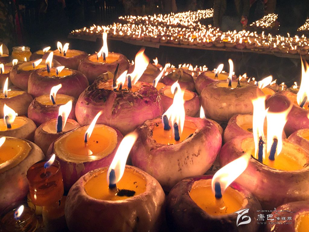 我州最具特色的燃燈節(jié)當(dāng)屬康定市城內(nèi)安覺(jué)寺舉辦的燈會(huì)。每到這一天,康定市民會(huì)將本地盛產(chǎn)的“芫根”洗干凈,然后掏空中間的瓤,在里面放置燈芯,做成酥油燈盞,入夜以后,數(shù)萬(wàn)盞酥油燈一起點(diǎn)燃。因此又稱“芫根燈會(huì)”。12月6日晚,康定市民結(jié)伴相約前來(lái)安覺(jué)寺祈福,盛況空前。