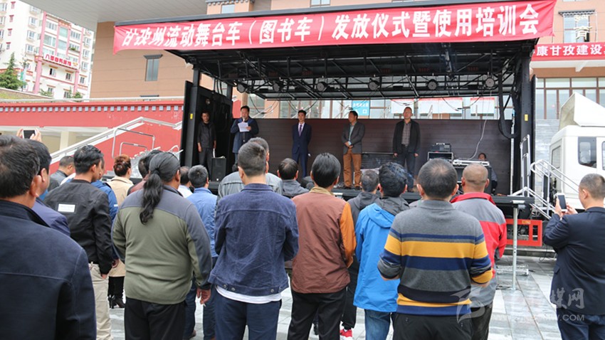 本網(wǎng)訊(記者 宋志勇 文/圖)6月22日,我州流動舞臺車(圖書車)發(fā)放儀式暨使用培訓會在康定舉行,旨在為全州13個縣(市)及州歌舞團、州圖書館統(tǒng)一配發(fā)流動舞臺車、圖書車,著力解決基層群眾看文藝演出難、看圖書難以及文藝表演團體下鄉(xiāng)演出搭臺難、轉(zhuǎn)點難等實際困難,進一步豐富基層農(nóng)牧民群眾文化生活。這是繼全國文化信息資源共享、鄉(xiāng)鎮(zhèn)綜合文化站建設實施的又一文化惠民工程。