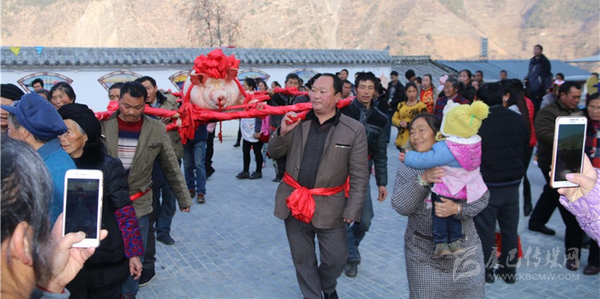 5個(gè)村民將年豬抬到秤上。360斤。村民為年豬準(zhǔn)備大紅花。準(zhǔn)備紙錢(qián)、香蠟。9點(diǎn)整,殺豬匠開(kāi)始了他的工作,在眾人齊心協(xié)力下,光溜溜的年豬被打整干凈?!氨S游覀兇鍋?lái)年風(fēng)調(diào)雨順、五谷豐登,村民平安健康?!贝逯欣险呔催^(guò)天地后,8個(gè)身強(qiáng)力壯的村民站在年豬旁,豎著拇指齊聲說(shuō),今年家家戶戶還要養(yǎng)大肥豬。抬著年豬,村里的中老年人簇?fù)碇?,走在最前面,唱著悅耳的民謠,大意是歌唱幸福生活的,迎著2018年的第一縷陽(yáng)光,村民們喜氣洋洋。到村里來(lái)的游客蜂擁拍照。