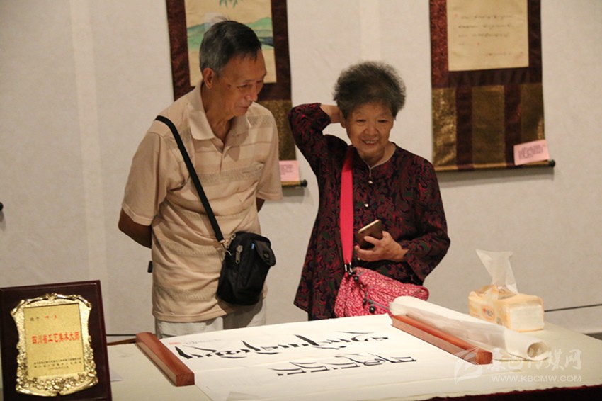 鋪紙、拿筆、蘸墨、彎腰.....15日上午,四川省工藝大美術(shù)師呷多繼續(xù)在現(xiàn)場演示藏文書法?!斑@種筆是特制的嗎?”“您寫的藏文是什么意思?”“學(xué)習(xí)藏文書法難不難?”觀展者們發(fā)出各種疑問。來自雙流的高先生表示,平日就對書法感興趣,能見到現(xiàn)場演示的藏文書法,毫無疑問讓他擁有了十分愉快的周末。