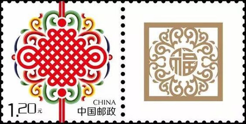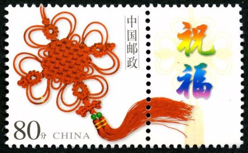 2002年5月10日,中國郵政發(fā)行《如意》個性化服務專用郵票一枚。主票圖案為如意柄端系著一個紅色“中國結”,附票有“祝福”二字; 2003年3月3日,中國郵政發(fā)行《同心結》個性化服務專用郵票一枚。主票圖案為盤長結4邊編織有心型繩結的同心結,附票為“祝福”二字;2006年9月25日,中國郵政發(fā)行《中華全國歸國華僑聯(lián)合會成立五十周年》紀念郵票一枚。圖案為阿拉伯數(shù)字“5”與中華全國歸國華僑聯(lián)合會圓形會徽組成數(shù)字“50”,象征全國僑聯(lián)五十周年,背景畫面為淡淡的粉紅色“中國結”。寓意歸國華僑與全國人民血肉相連,同心同德共同建設美好家園;2013年8月8日,中國郵政發(fā)行一枚《美好祝福》賀卡專用郵票,圖案為象征喜慶的紅色“中國結”;2014年9月20日,中國郵政發(fā)行《中國夢(二)——民族振興》特種郵票,其中第四枚“民族團結”,圖案中載歌載舞的各民族群眾上方有一個大紅的“中國結”,象征著各民族大團結。