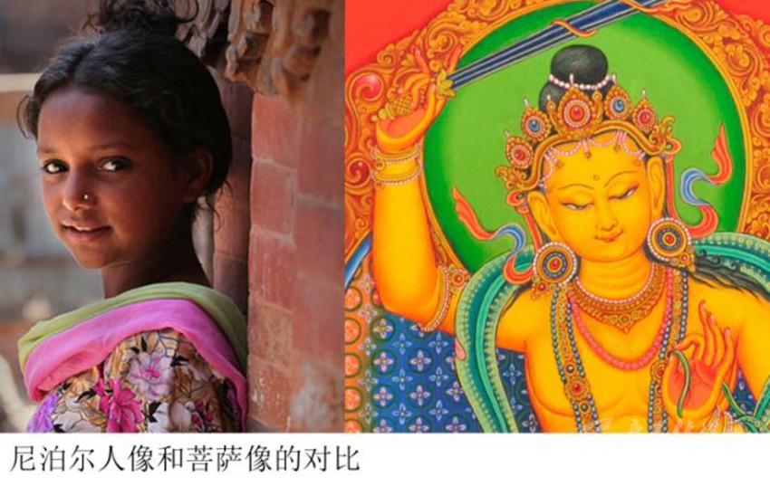 特別值得注意的是:之前佛教藝術(shù)的帕拉風(fēng)格繪畫中的臉型普遍是方正偏長的,而在尼瓦爾唐卡里,臉型普遍是方正偏短。偏短的方臉會讓五官顯得更加集中一點,特別是眉額比較大、眼睛位置下移,這樣的感覺有點近似于嬰兒的面部比例。而眉骨、鼻骨高挺,又不似兒童,這樣的面部特征其實和尼國人的長相比較接近。也許是尼瓦爾人善于觀察、擅長描摹的天分,逐漸把本民族沉靜的性格與容貌,潛移默化地滲透進了唐卡,產(chǎn)生了新的風(fēng)貌。