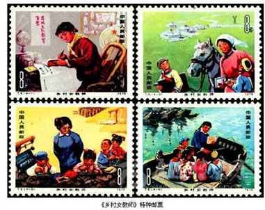 “燃燒自己,照亮別人”,是每一位教書人的精神寫照。在我國發(fā)行的郵票中就常常出現(xiàn)那些工作在基層的普通教師的忙碌身影。1959年9月25日,我國發(fā)行《人民公社》特種郵票,其中第5枚“學(xué)”,圖案是一位手執(zhí)課本神情專注地在課堂上教學(xué)的老師。這是我國郵票中首次出現(xiàn)教師形象。1966年5月10日,我國發(fā)行《服務(wù)行業(yè)中的婦女》特種郵票,其中第4枚“保育員”,是反映我國幼兒教師工作情景的一枚郵票。1976年2月20日,我國發(fā)行《勝利完成第四個五年計劃》紀(jì)念郵票,其中第13枚“牧區(qū)小學(xué)”,圖案是一位藏族女教師在寬敞明亮的教室里授課的情景,反映了新中國成立后,特別是第四個五年計劃期間,我國少數(shù)民族地區(qū)飛速發(fā)展的教育事業(yè)。1975年3月8日,我國發(fā)行《鄉(xiāng)村女教師》特種郵票,全套4枚,圖案分別是“認(rèn)真看書學(xué)習(xí)”“巡回教學(xué)”“開門辦學(xué)”和“水上小學(xué)”。全套郵票是工作在廣大農(nóng)村的中小學(xué)教育工作者在辦學(xué)條件艱苦的情況下仍然堅持認(rèn)真學(xué)習(xí)、勤奮工作、忠于黨的教育事業(yè)的真實寫照。