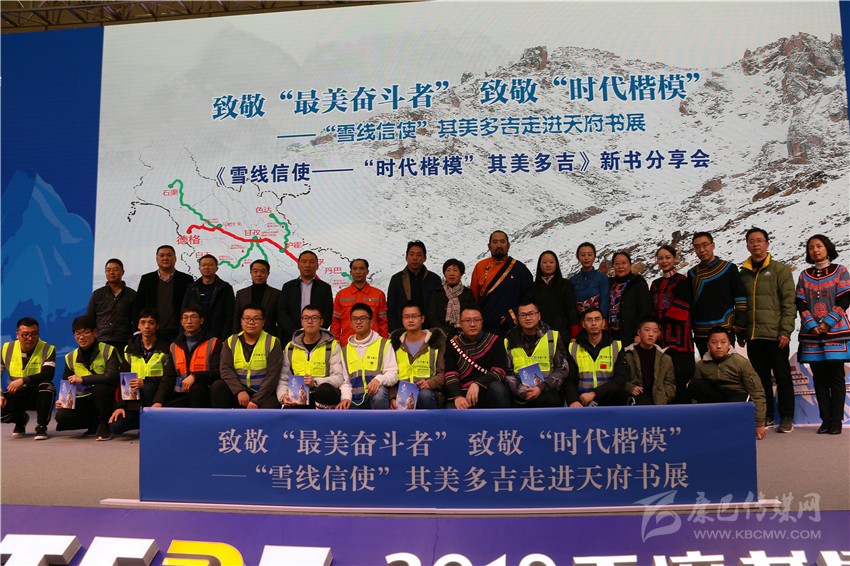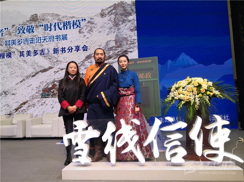 在分享會舞臺的一側(cè),靜置著書籍《雪線信使——“時代楷模”其美多吉》放大后的封面。封面上,其美多吉、藍天與雪山相得益彰,構(gòu)成了一幅獨具特色的畫面。