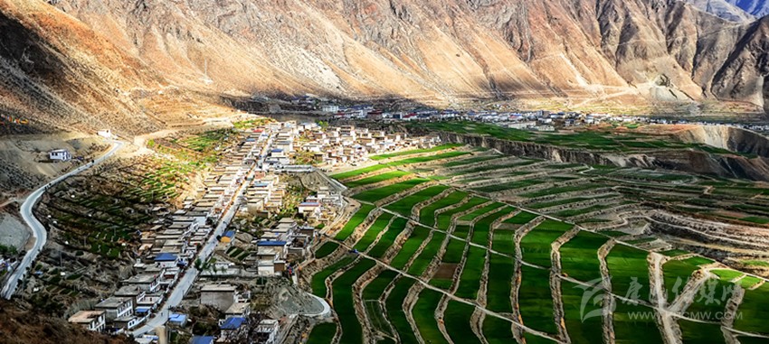 從得榮縣城出發(fā),途經(jīng)日龍鄉(xiāng),汽車順著盤山公路開始往下行駛,到半山腰處,司機(jī)輕輕踩一腳剎車熄火,在此作短暫休息。這時(shí),我打開車門俯瞰金沙江畔的因都?jí)?,但?jiàn)公路兩側(cè)一排排整齊的房屋像火柴盒一樣連綴在平坦壩子上,房屋下端,麥田梯次舒展,麥浪涌動(dòng),蔚為壯觀。