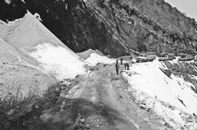 直到上世紀(jì)的七八十年代,人們要翻越二郎山,無疑還是把腦袋別在褲腰帶上的冒險之旅,彎急、坡陡、路窄、高反,再加泥濘濕滑,尤其艱難的是上半山那段路,兩道深深的車轍坑槽,車輛只能沿車轍上山,蝸牛般爬行,離開坑槽就意味著死亡,遇上錯車誰都不愿冒險出槽,越“雷池”一步。車速要快快不起來,想慢慢不下去,拿駕駛員們的話說就是:上山把踩油門的腳蹬進(jìn)了油箱,車子跑不快,下山那怕是剎車踩死,車子還是停不下,堵車成家常便飯,拋錨隨時會有發(fā)生。