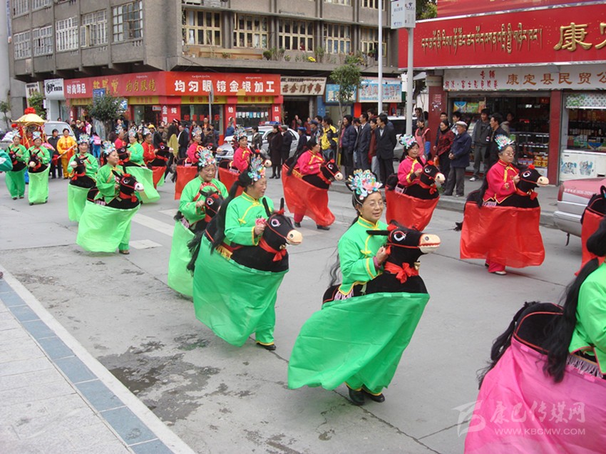 半個(gè)世紀(jì)風(fēng)靡康定城的“船燈”、“馬馬燈”、“鬧山鼓”、“扭秧歌”、“笑頭和尚戲柳翠”、“霸王鞭”……整個(gè)兒就像老陜過年時(shí)的“社戲”場(chǎng)面。大年初一、十五夜“出燈”游街,熱鬧氣氛把整個(gè)年節(jié)塞得滿滿的。記得我孩童時(shí)見過一次“出燈”游行,不是晚上而是在大白天(叫“出游”)。寺廟喇嘛吹奏佛樂走在前面,接著是“川北”人的川劇鑼鼓;再后面跟著的就是“馬馬燈”、劉老陜的“船燈”、鐵木社的“龍燈”、二輕局的“霸王鞭”、南門上的弦子隊(duì)、三居委的腰鼓隊(duì)、北三巷的“道孚鍋莊隊(duì)”……游行隊(duì)伍遇街口寬敞地方必圍圈演出?!叭死侠?,人老啦,人老先從頭上老,白的多來黑的少, 開——船——羅!”“銀須飄灑”的艄公劉老陜用俏皮逗趣的陜腔告白開場(chǎng)詞,在歡喜鑼鼓的伴奏中“劃”著旱船出了場(chǎng)。旱船闖“急流”、過“險(xiǎn)灘”,風(fēng)趣又逼真;如果哪家的姑娘打扮成古裝戲里的嬌美仕女坐上旱船游了街,那她立馬就成了康定城人皆贊譽(yù)的“美女”。接著就是“馬馬燈”,幾十個(gè)“騎馬橫槍”的古裝將士馳騁上場(chǎng),排兵布陣,穿梭并行,“馬”鈴聲鼓樂聲交織一起……鬧翻了康定城的“三山二水”。